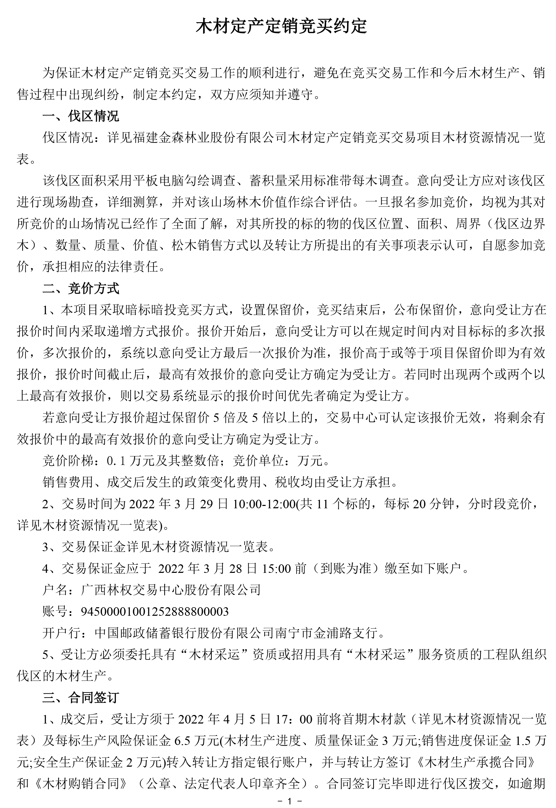 保證金及 處理方式 | 1.須交納的交易保證金詳見木材資源情況一覽表。 2.交易保證金應于2022年3月28日15:00前(到賬為準)繳至如下賬戶: 戶名:廣西林權交易中心股份有限公司 賬號:94500001001252888800003 開戶行:中國郵政儲蓄銀行股份有限公司南寧市金浦路支行 注: ①交易保證金只接受銀行柜臺、網銀、電匯轉賬,不接受ATM轉賬、現金繳款; ②交易保證金轉賬單上須注明參與競拍哪一標的保證金 (如:0329金森1標保證金)。 3. 交易成交,在收到交易雙方出具的《款項收訖及正式書面合同簽訂確認函》后的5個工作日內,受讓方已交納的交易保證金由交易中心直接轉到福建金森林業股份有限公司指定銀行賬戶充抵履約保證金。 4.交易成交,受讓方如未按本公告約定與轉讓方簽訂成交文件的,或違反交易中心交易規則的,其已交納的交易保證金將不予返還; 5.未成交者的交易保證金交易中心將在交易結束后次日起3個工作日內全額無息返還。 | ||