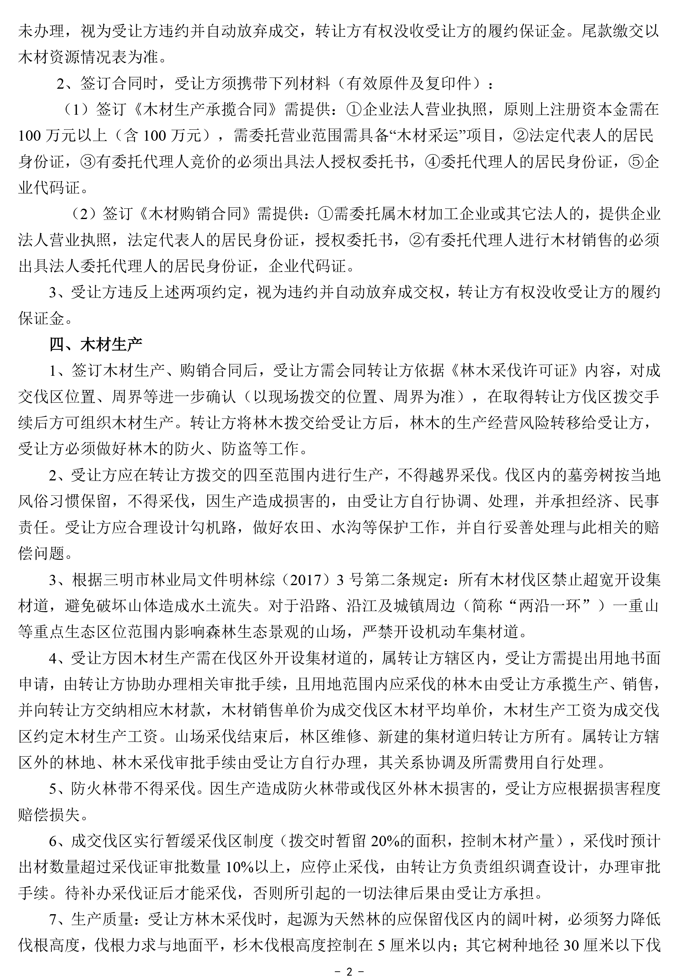 成交確認、價款支付及合同簽訂 | 1 .成交后的兩個工作日內受讓方以微信、郵箱等方式收到《成交通知書》掃描件或電話通知;若受讓方未及時收到成交通知書的,請主動與轉讓方聯系。 2.價款交納日期及方式:成交后,受讓方須于2022年4月5日17:00前將首期木材款(詳見木材資源情況一覽表)及每標生產風險保證金6.5萬元(含木材生產進度、質量保證金3萬元;銷售進度保證金1.5萬元;安全生產保證金2萬元)轉入轉讓方指定銀行賬戶,并與轉讓方簽訂《木材生產承攬合同》和《木材購銷合同》。尾款交付方式以木材資源情況一覽表為準。 轉讓方指定銀行賬戶如下: 戶名:福建金森林業股份有限公司 開戶銀行:福建將樂成功村鎮銀行股份有限公司 賬號:9031510010010000033058 3.受讓方不依據本公告的要求履約的,視為自動放棄受讓資格,其已交納的交易保證金不予退回,并對交易中心因此造成的損失承擔賠償責任,轉讓方有權將該標的重新組織競買交易。 | ||